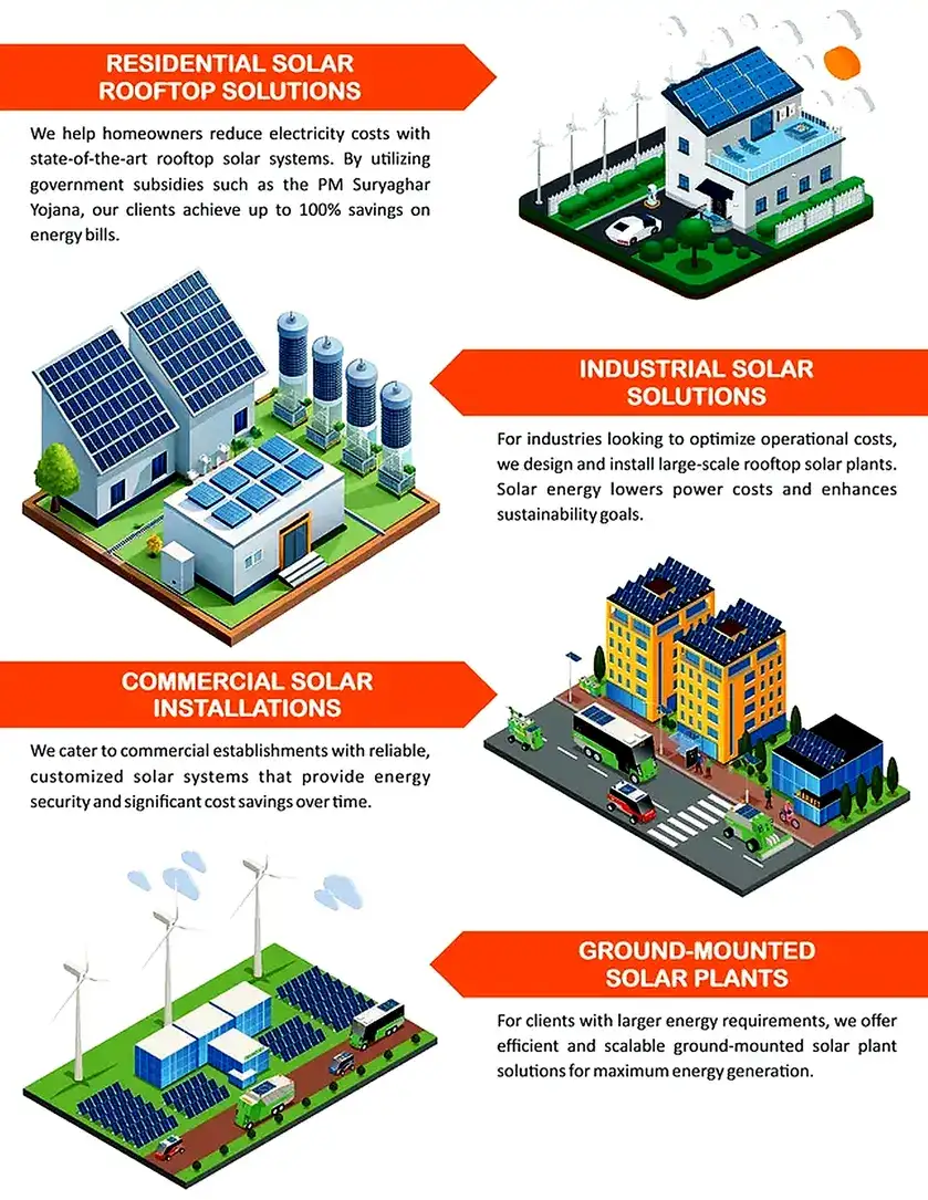 We design and install customised rooftop solar systems for homes across India. Our solar solutions help homeowners get direct benefit from government subsidies, reduce electricity bills, and generate clean energy with minimal maintenance and long-term reliability assured.